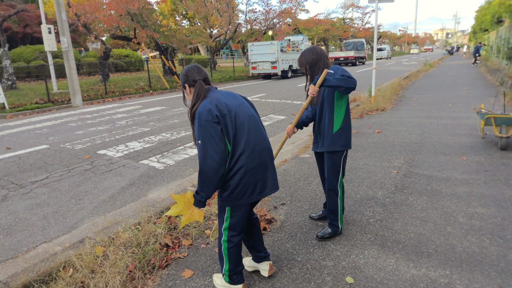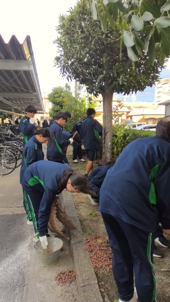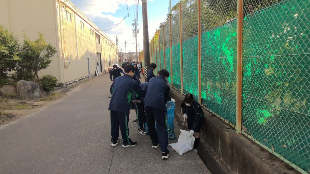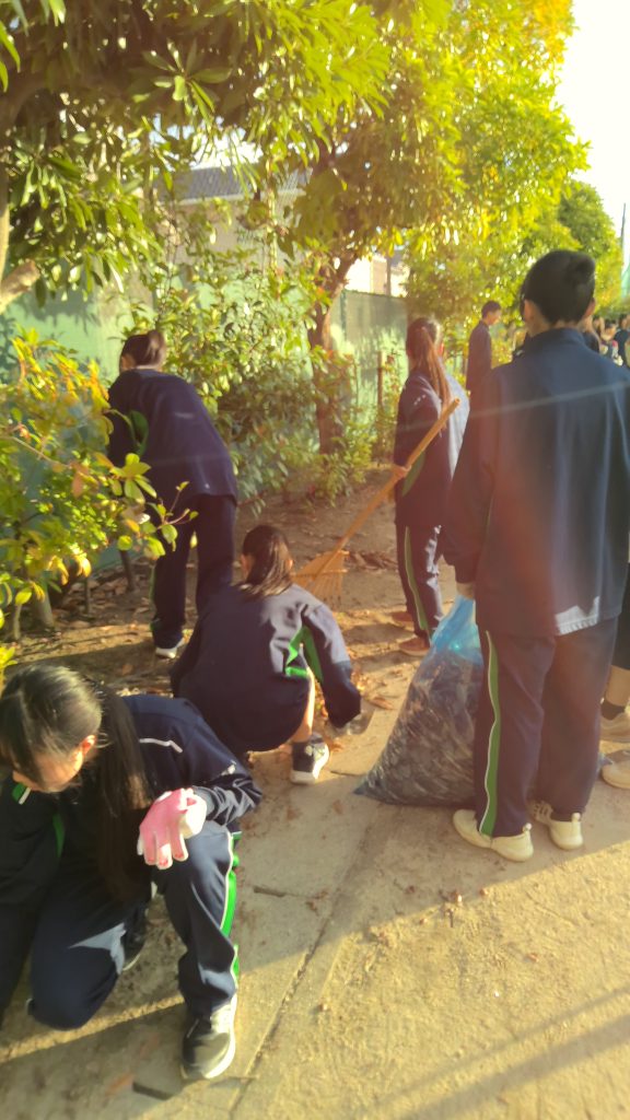 11月10日、1年生が環境美化活動として校舎外清掃を行いました。強風の中たいへんでしたが熱心に取り組みました。