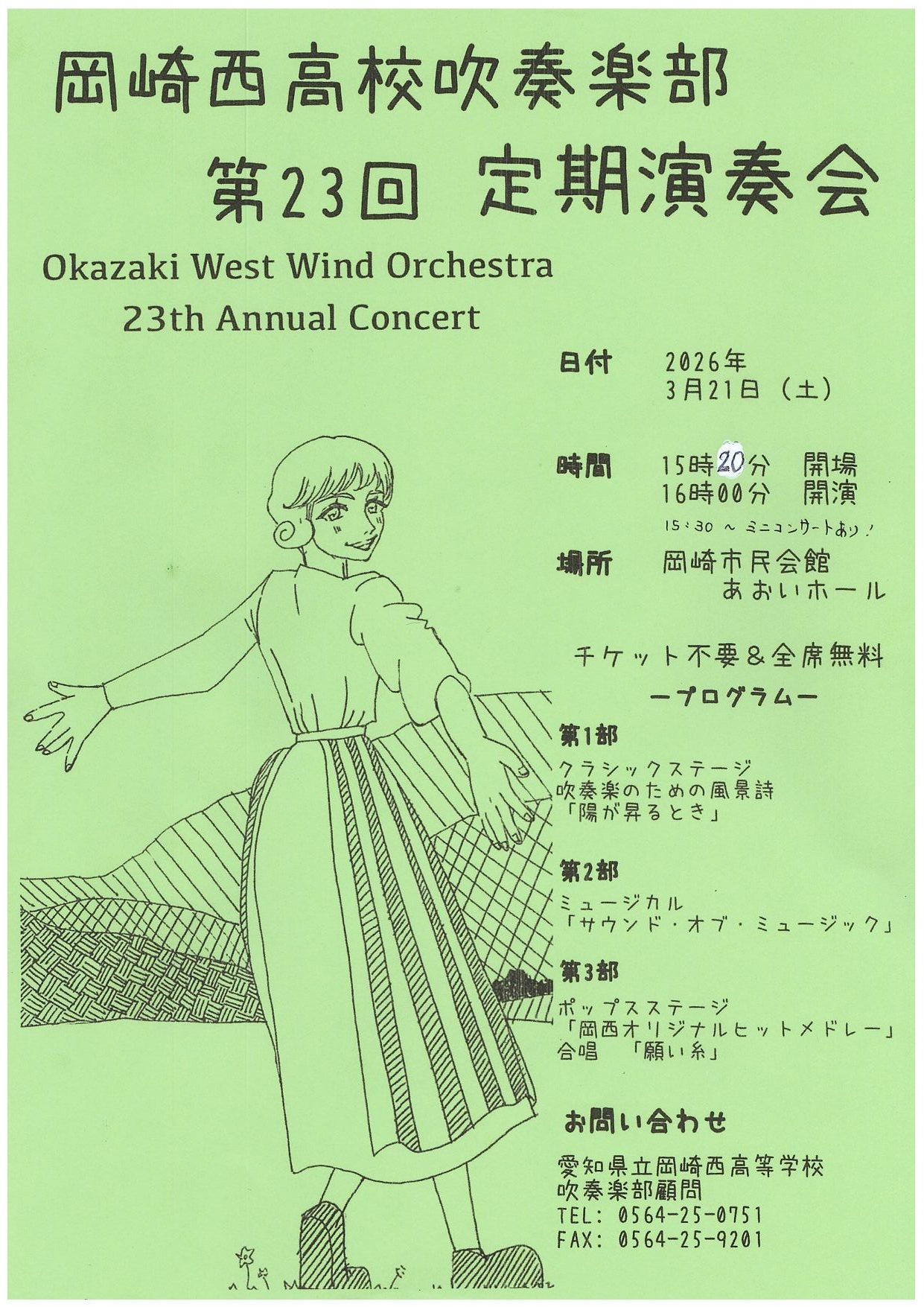 追伸:吹奏楽部は3月21日(土)に、定期演奏会を行います。全席無料&チケット不要です。詳しくは下のチラシを御覧ください。特に4月からの新入生で吹奏楽部に入部希望の方は是非来てください。