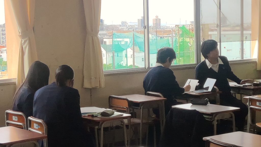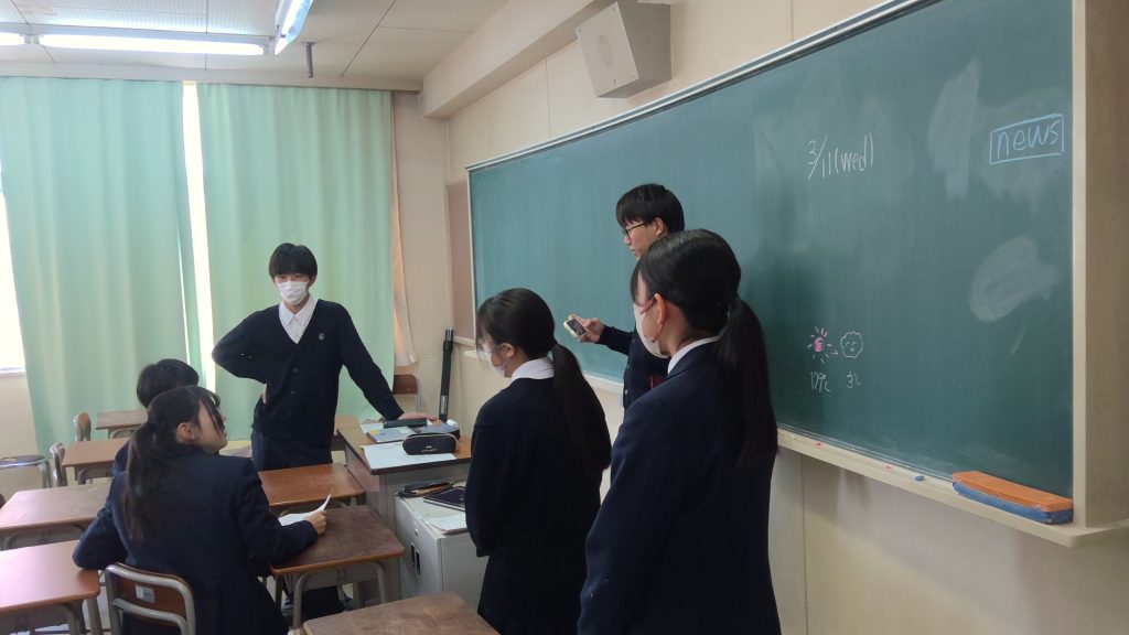チームでアイディアを出し合い、構成を考え、英語のセリフを練習し、各自タブレットのロイロノートで撮影し、最後に上映会を行いました。ニュースの内容は、花粉症、コロナウィルス、学習と睡眠の関係、カフェインの効用、SNS関係など、実にバリエーション豊かでした。