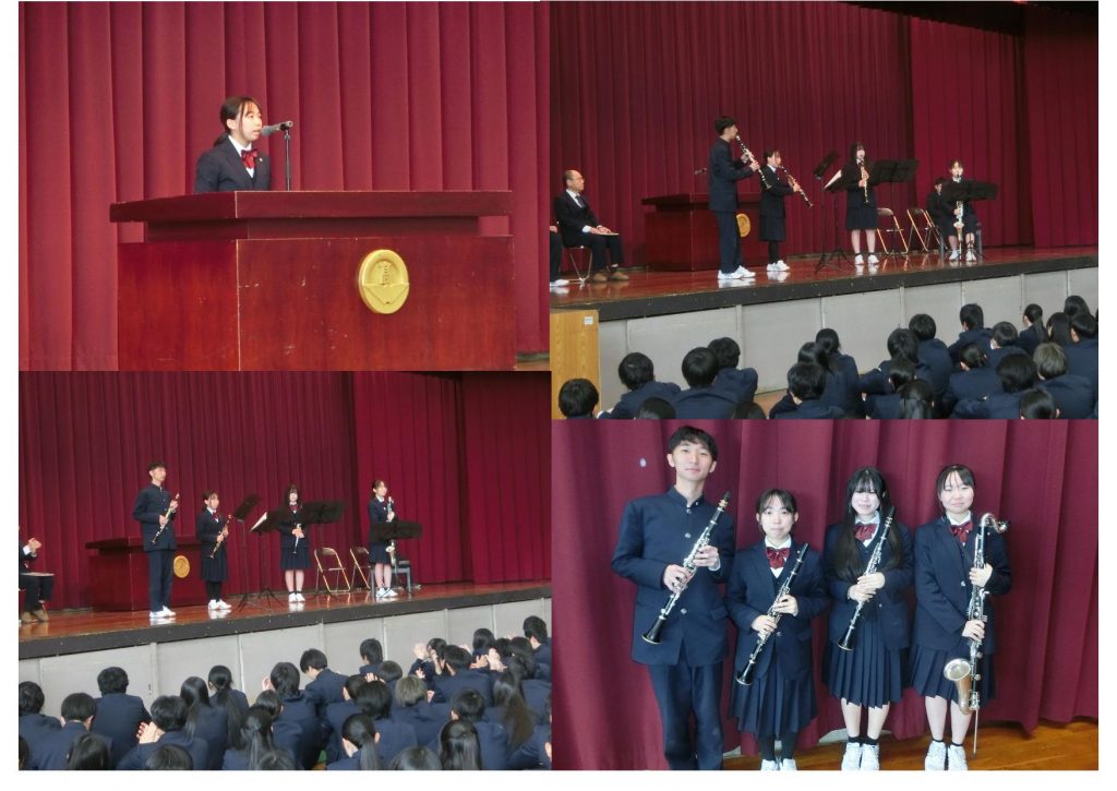 クラリネット四重奏の4名の部員が出場します。校長先生、生徒会長からの激励のあと、代表生徒が誓いの言葉を述べ、素晴らしい演奏を披露してくれました。